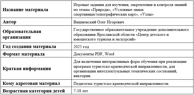 Игровые задания для изучения, закрепления и контроля знаний по темам «Природа», «Условные знаки спортивных/топографических карт», «Узлы» Государственное образовательное учреждение дополнительного образования Ярославской области «Центр детского и юношеского туризма и экскурсий» |